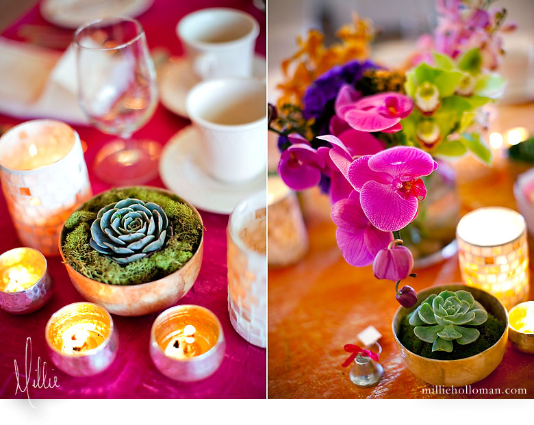 There was however....color and loads of it-beautiful vibrant, happy color. Lovely,dreamy cream capiz shell bowls filled with succulent blossoms and vases spilling over with intensely beaming hot house orchids lit by hammered silver votives.